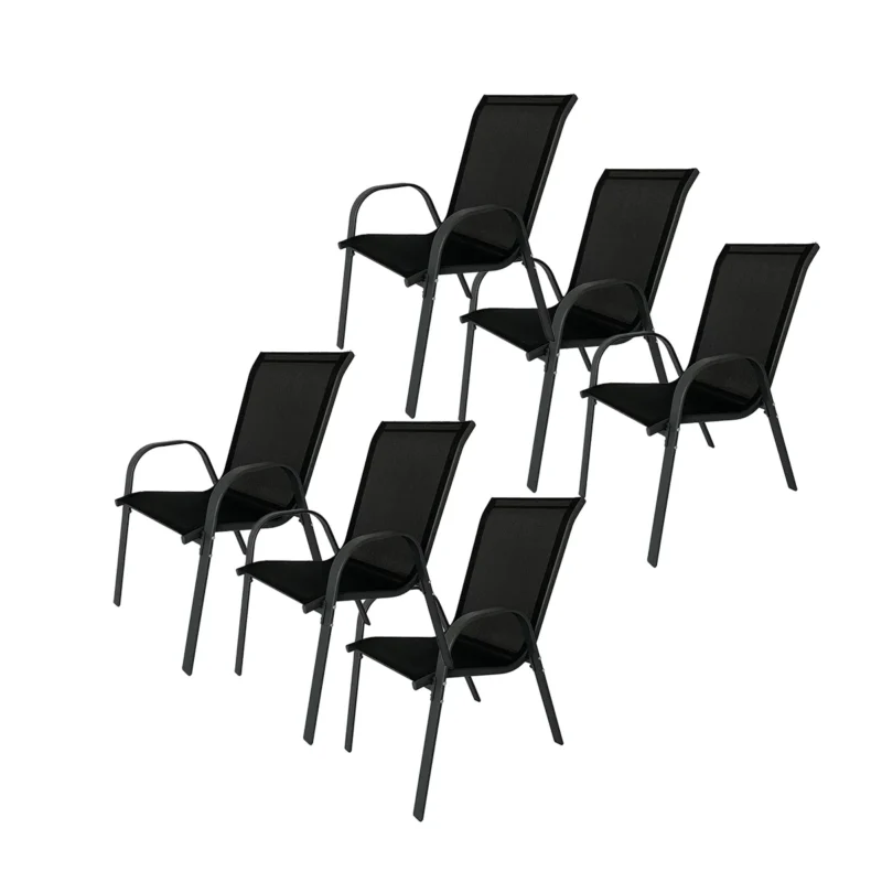 Crna baštenska stolica sa sjedalom i naslonom od tekstila i okvirom od čelika sa zaštitnim premazom. Tekstilen je udoban materijal postojanih boja koji se brzo suši i lako se čisti. Baštenske stolice se mogu složiti jedna na drugu za kompaktno skladištenje.